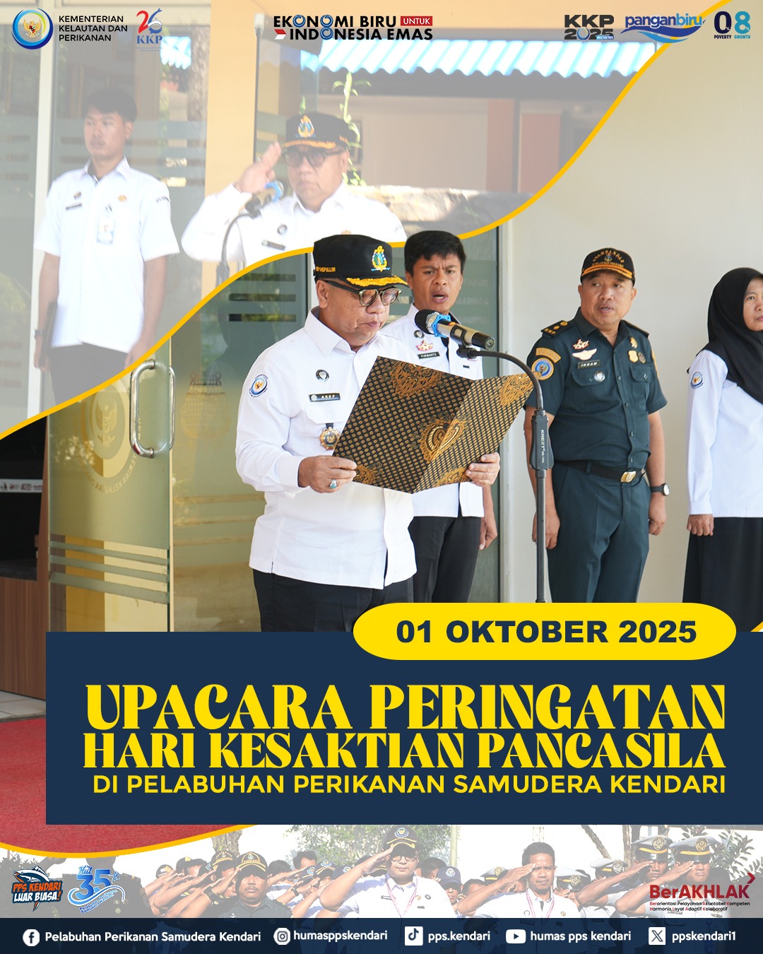 Pelabuhan Perikanan Samudera Kendari melaksanakan Upacara Peringatan Hari Kesaktian Pancasila, dengan Kepala PPS bertindak sebagai instruktur upacara. Momen ini menjadi pengingat bagi kita semua untuk senantiasa menghormati dan mengenang jasa para pahlawan yang telah berkorban dalam peristiwa G30S/PKI demi tegaknya Pancasila sebagai dasar negara. ✨🇮🇩