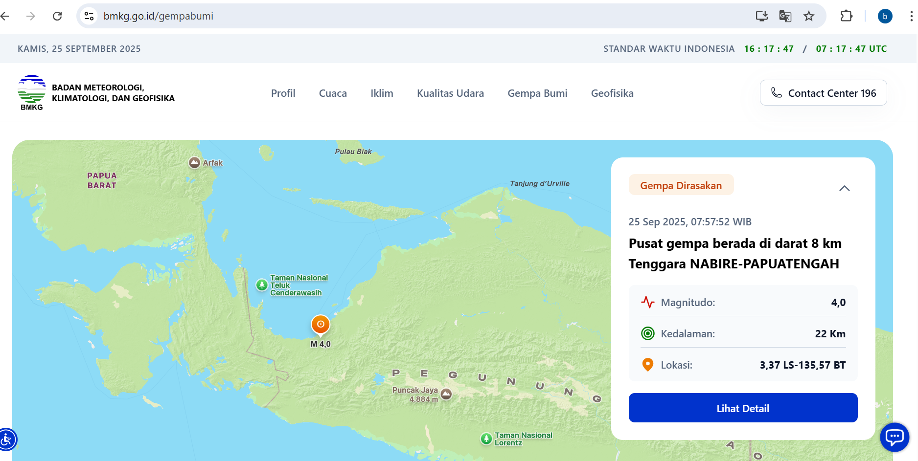Pusat gempa berada di darat 8 km Tenggara NABIRE-PAPUATENGAH