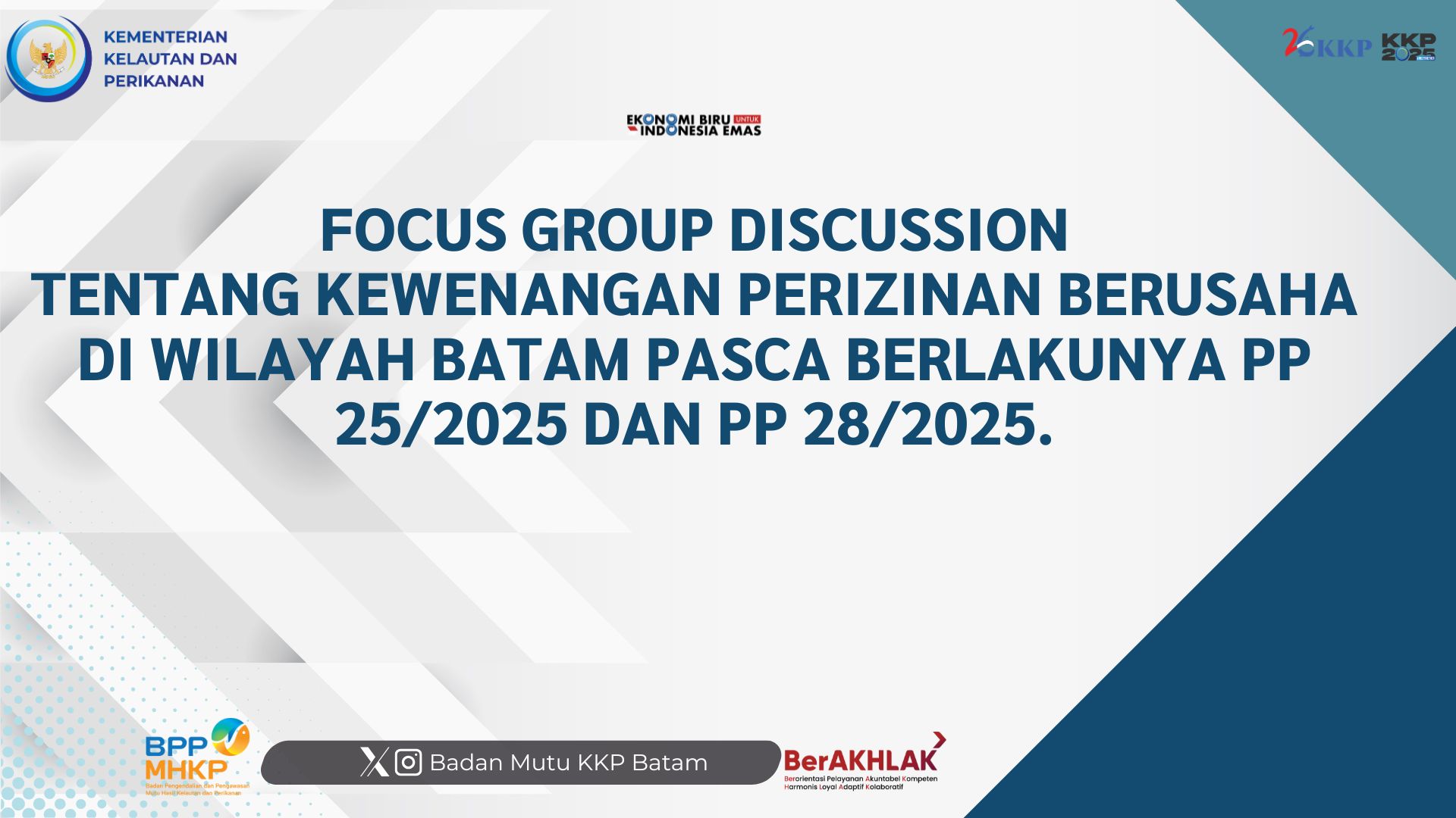 Sehubungan dengan berlakunya PP 25/2025 dan PP 28/2025 untuk Kawasan Perdagangan Bebas dan Pelabuhan Bebas Batam, maka dianggap perlu dilakukan harmonisasi dan sinkronisasi secara detail terkait kewenangan penerbitan perizinan dan pelayanan di sektor Kelautan dan Perikanan antara Badan Pengusahaan Batam, Pemerintah Kota Batam, dan UPT Kementerian Kelautan dan Perikanan di Kota Batam. Tujuannya agar pelayanan kepada pelaku usaha dan masyarakat dapat tetap terlaksana dan tidak ada masalah dengan hukum di kemudian hari. Berkaitan dengan hal tersebut, dengan ini kami mengundang Bapak/Ibu untuk dapat mengikuti kegiatan yang akan diselenggarakan pada :