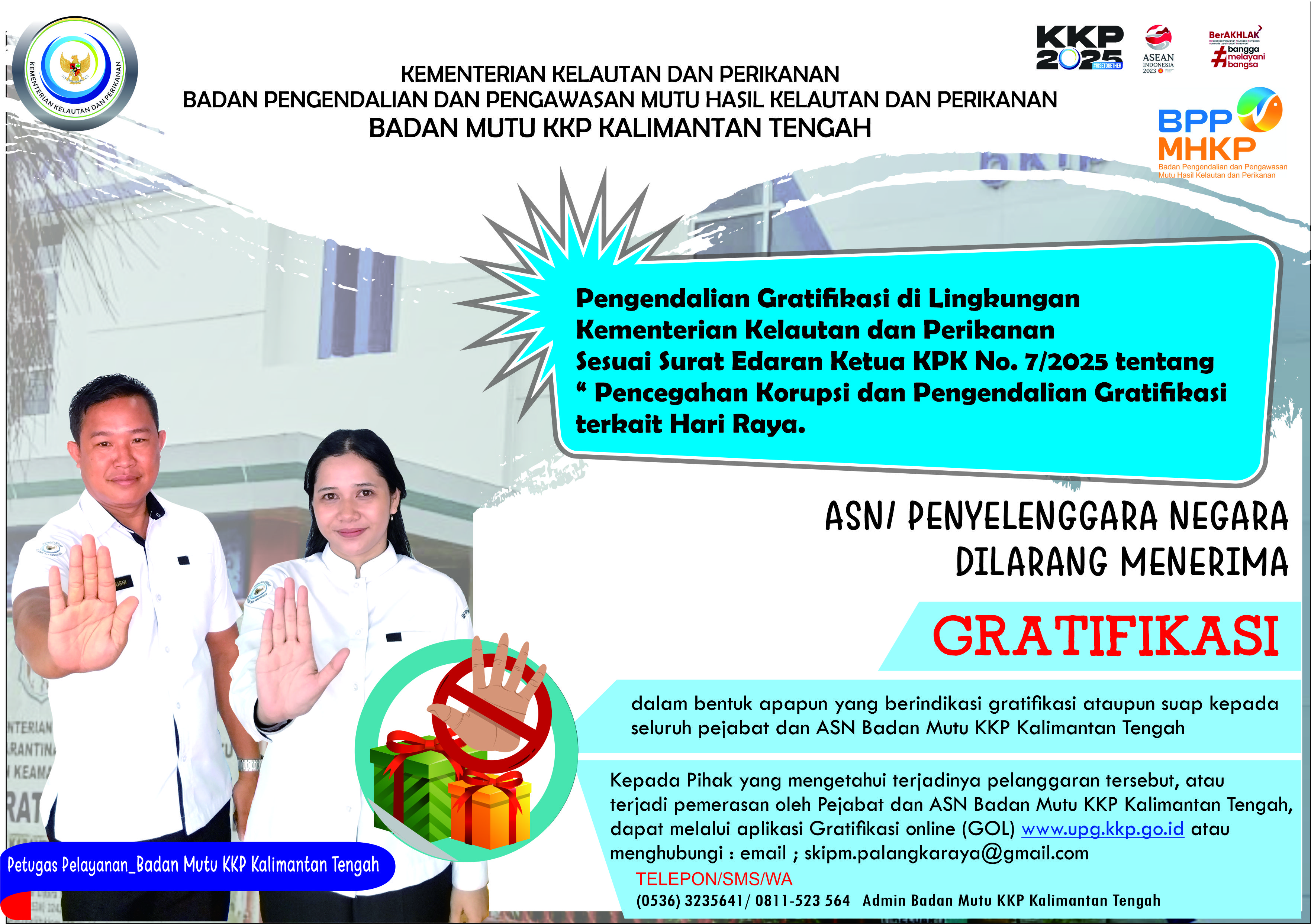 Badan Mutu Kementerian Kelautan dan Perikanan Kalimantan Tengah akan terus berkomitmen menjaga integritas dengan meolak segala bentuk gratifikasi, menjauhi korupsi dan bebas dari segala bentuk kolusi dan nepotisme, demi tercapainya integritas bangsa yang bebas dari korupsi, kolusi dan nepotisteme