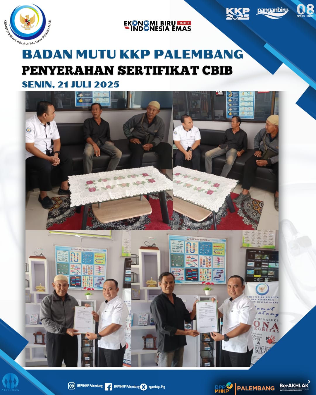 Badan Mutu KKP Palembang menyerahkan Sertifikat CBIB (Cara Budidaya Ikan yang Baik) kepada para pembudidaya yang telah memenuhi standar budidaya yang higienis, ramah lingkungan, dan berkelanjutan. ✅