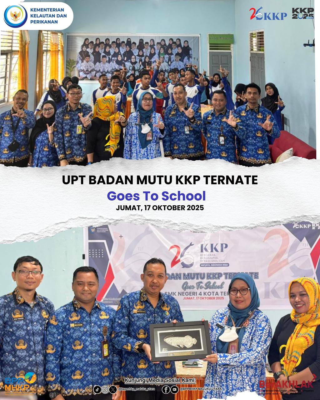 TERNATE – Dalam rangka memperingati Hari Ulang Tahun Kementerian Kelautan dan Perikanan (KKP) ke-26 tahun 2025 dengan tema “Bergerak, Berdampak, dan Berkelanjutan,” Badan Mutu KKP Ternate melaksanakan kegiatan Goes To School di SMK Negeri 4 Kota Ternate.