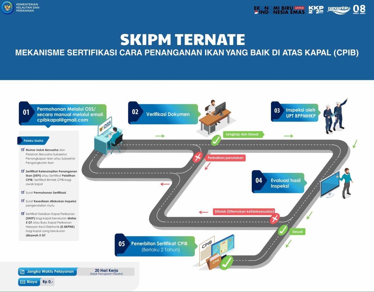 Kementerian Kelautan dan Perikanan melalui Badan Mutu KKP Ternate Maluku Utara melayani 9 sertifikasi diataranya : 1. Sertifikasi Cara Penerapan Distribusi Ikan (SPDI) 2. Sertifikasi Sertifikat Kelayakan Pengolahan (SKP) 3. Sertifikasi HACCP 4. Sertifikasi Cara Pembuatan Obat Ikan Yang Baik (CPOIB) 5. Sertifikasi Cara Penanganan Ikan Yang Baik diatas Kapal (CPIB) 6. Sertifikasi Cara Pembenihan Ikan Yang Baik (CPIB) 7. Sertifikasi Cara Budidaya Ikan Yang Baik (CBIB) 8. Sertifikasi Cara Pembuatan Ikan Yang Baik (CPIB) 9. Sertifikasi Cara Distribusi Obat Ikan Yang Baik (CDOIB) Bagi para Pelaku Usaha yang Ingin mendapatkan informasi terkait pernyataan untuk mengajukan sertifikasi silahkan datang langsung ke Kantor dijl. Bandar Udara Babullah Ternate, Kelurahan Tafure, Kecamatan Ternate Utara, Kota Ternate Provinsi Maluku Utara