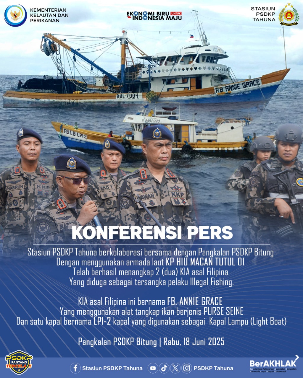 KIA asal Filipina ini bernama FB. Annie Grace yang menggunakan alat tangkap ikan berjenis Purse Seine dan satu kapal bernama LPI-2 kapal yang digunakan sebagai kapal Lampu (Light Bout) dan akan dilakukan Konferensi Pers pada hari Rabu, 18 Juni 2025.