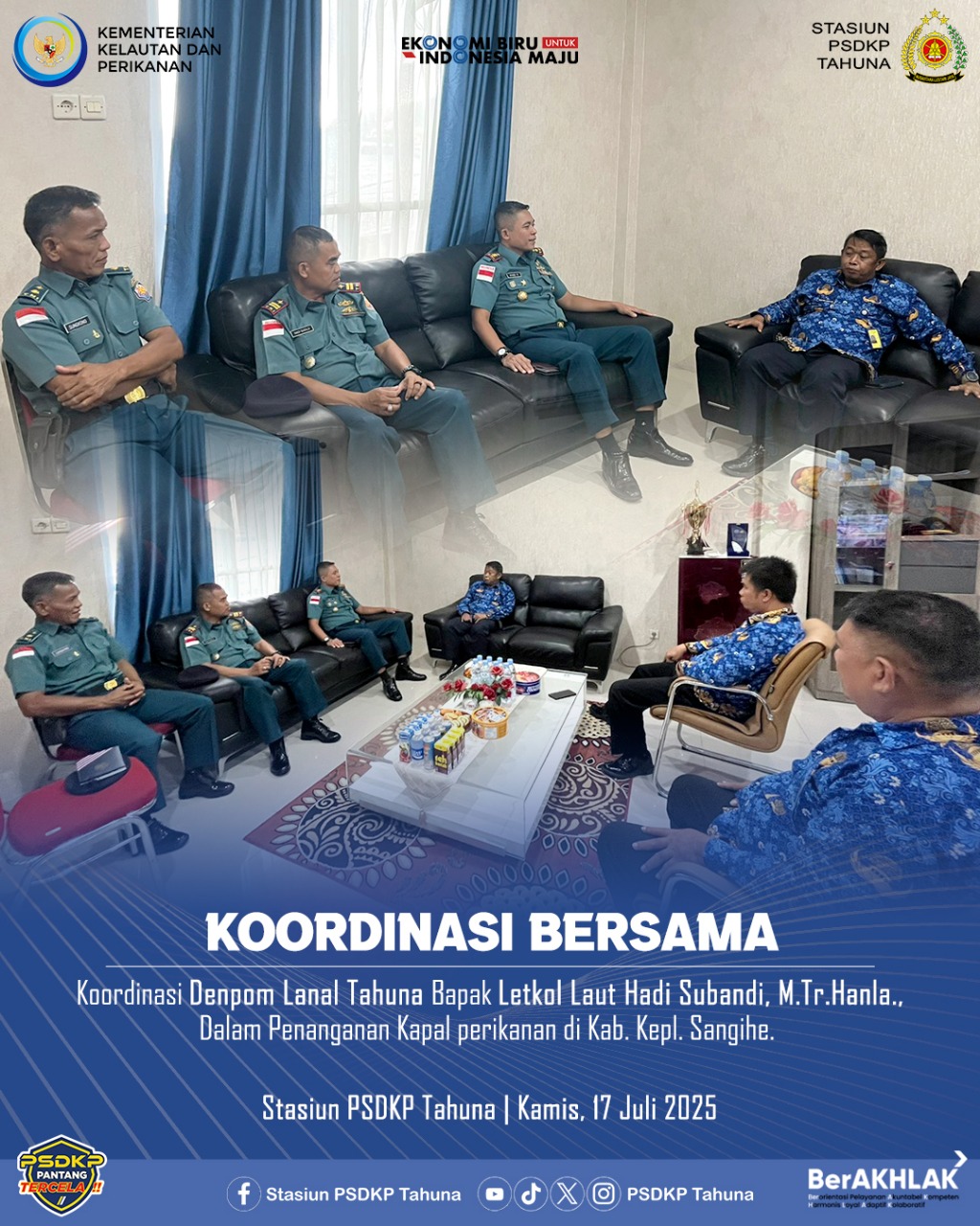 Koordinasi Denpom Lanal Tahuna, Bapak Letkol Hadi Subandi, M.Tr, Hanla, dalam Penanganan Kapal Perikanan di Kab. Kepl Sangihe, pada Kamis, 17 Juli 2025