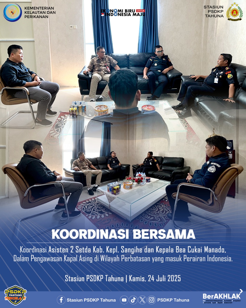 Koordinasi bersama dengan Asisten 2 Setda Kab. Kepl Sangihe dan Kepala Bea Cukai Manado dalam Pengawasan Kapal Asing di Wilayah Perbatasan yang masuk Perairan Indonesia, yang dilaksanakan pada Kamis, 24 Juli 2025