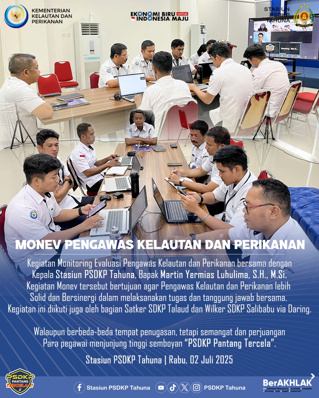 Kegiatan Monitoring dan Evaluasi Pengawas Kelautan dan Perikanan bersama Kepala Stasiun PSDKP Tahuna, Bapak Martin Yermias Luhulima, SH., M.Si. Kegiatan Monev tersebut bertujuan agar Pengawas Kelautan dan Perikanan lebih solid dan bersinergi dalam melaksanakan tugas dan tanggungjawab bersama. Kegiatan ini juga diikuti oleh Tim Pengawas Kalautan dan Perikanan yang berada di Satwas SDKP Talaud maupun Wiker SDKP Salibabu. Kegiatan ini dilaksanakan pada hari Rabu 2 Juli 2025.