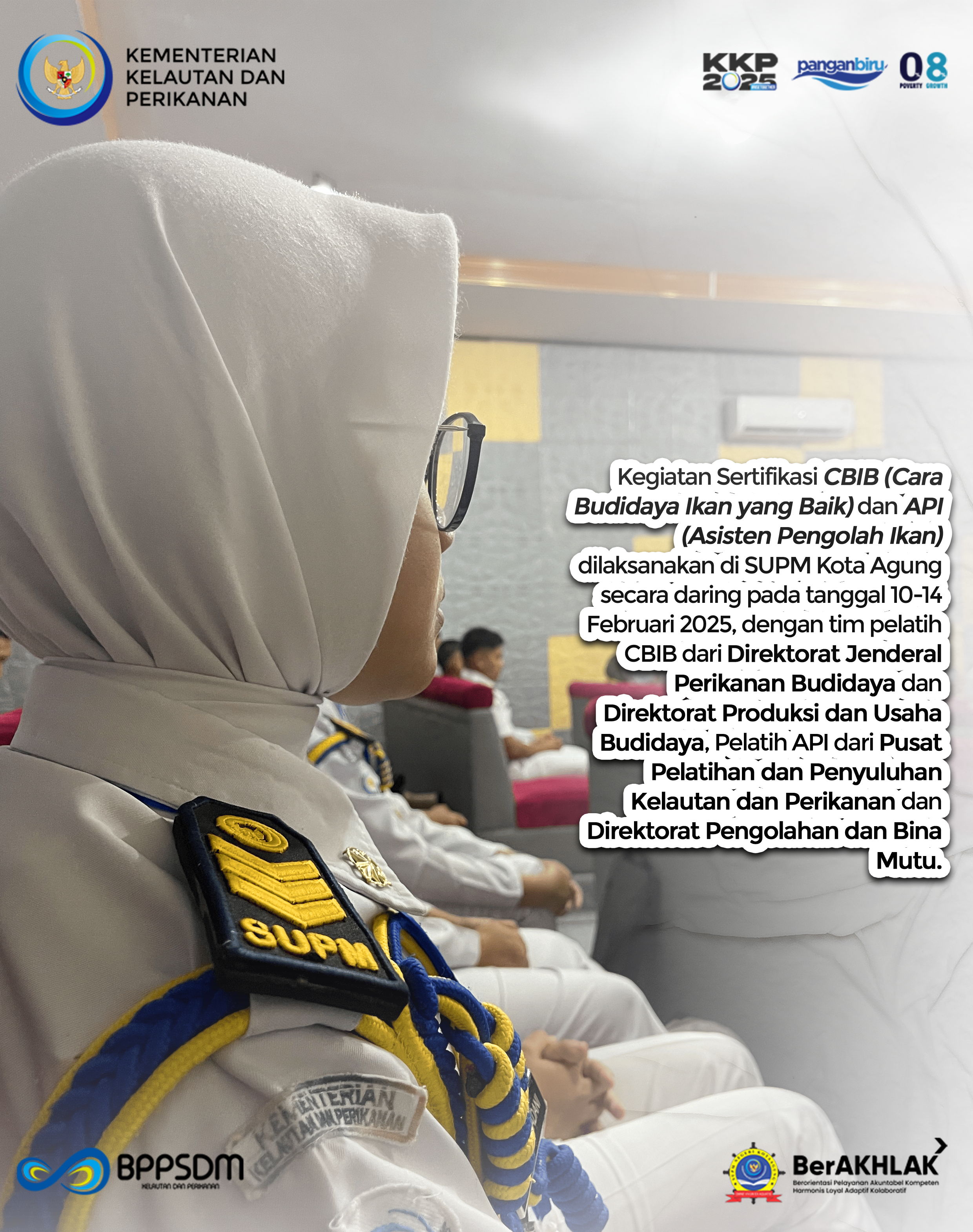 #baharilovers, hari ini 10 Februari 2025 SUPM Kota Agung melaksanakan kegiatan Pembukaan Sertifikasi CBIB (Cara Budidaya Ikan yang Baik) dan API (Asisten Pengolah Ikan) secara daring di Studio Mini SUPM Kota Agung.