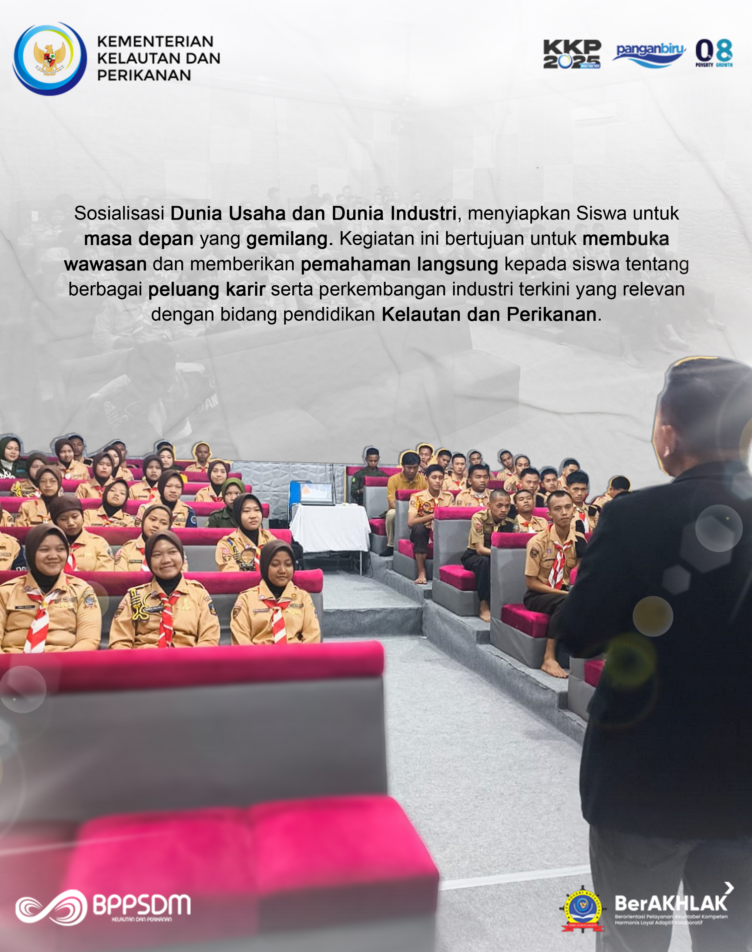 Kegiatan ini bertujuan untuk meningkatkan kesadaran dan pemahaman siswa tentang dunia usaha dan industri agar dapat mempersiapkan diri untuk mengembangkan kemampuan, pengetahuan, dan jaringannya serta meningkatkan kompetensi dan motivasi siswa untuk bisa menjadi alumni yg sesuai dengan kebutuhan dunia usaha dunia industri