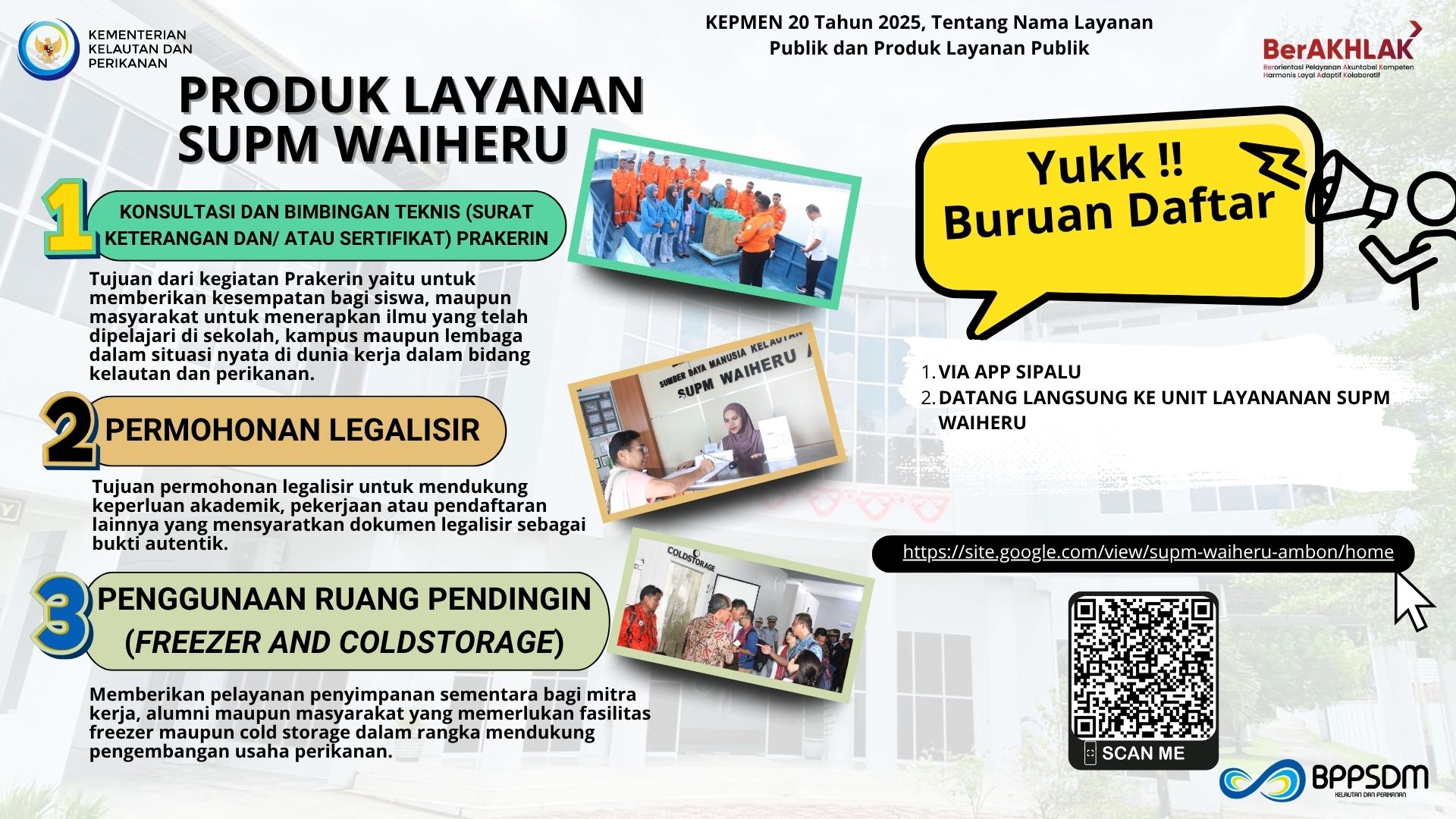 kamu bisa daftar produk layanan yang telah disediakan, secara offline di unit layanan terpadu SUPM Waiheru, jln. Laksdya leo Wattimena, KM. 16. Dan secara online pada laman : https://sites.google.com/view/supm-waiheru-ambon/home